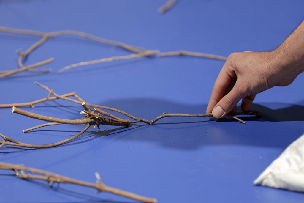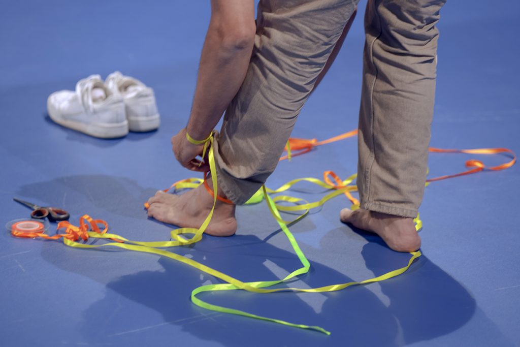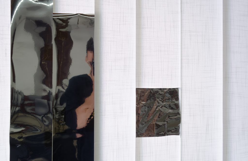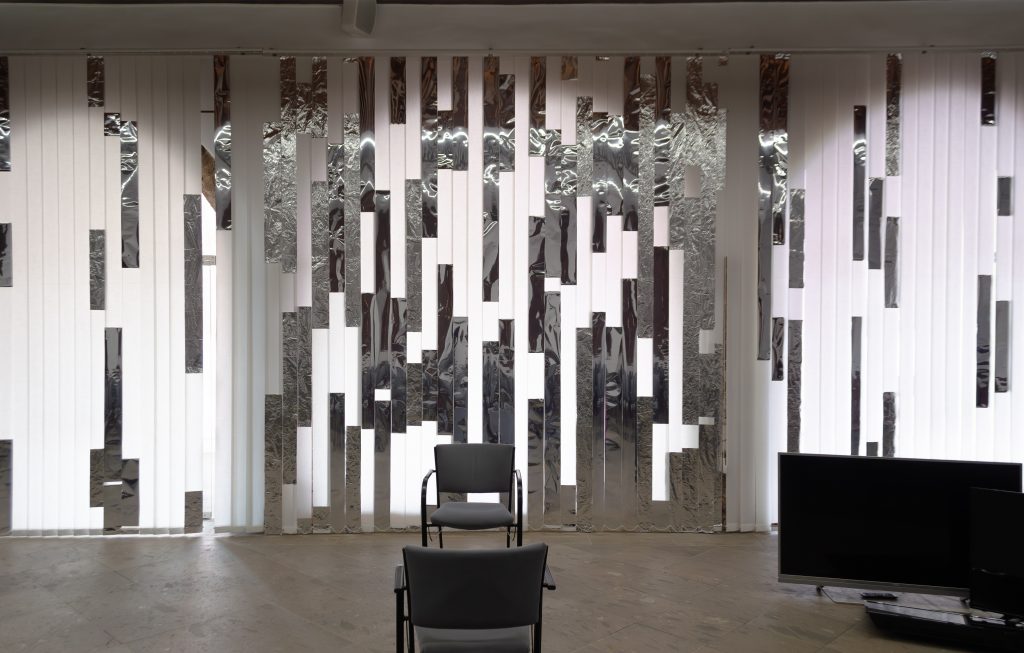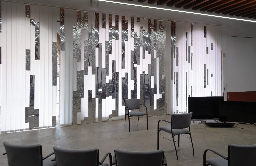 Aprovechando las características de la sala, diseño un escenario en el que las sillas se disponen en semicírculo, organizadas en agrupaciones numéricas basadas en números primos aleatorios. Intervengo las lamas de las cortinas verticales del espacio con materiales reflectantes que en ocasiones son lisos, y en otras arrugados. Las franjas, con longitudes diversas también de números primos, se distribuyen de manera aleatoria, componiendo una secuencia de silencios y ruidos muy próxima a lo musical. El reflejo produce la imagen duplicada de un cuerpo fragmentado que oscila entre la presencia y la ausencia.