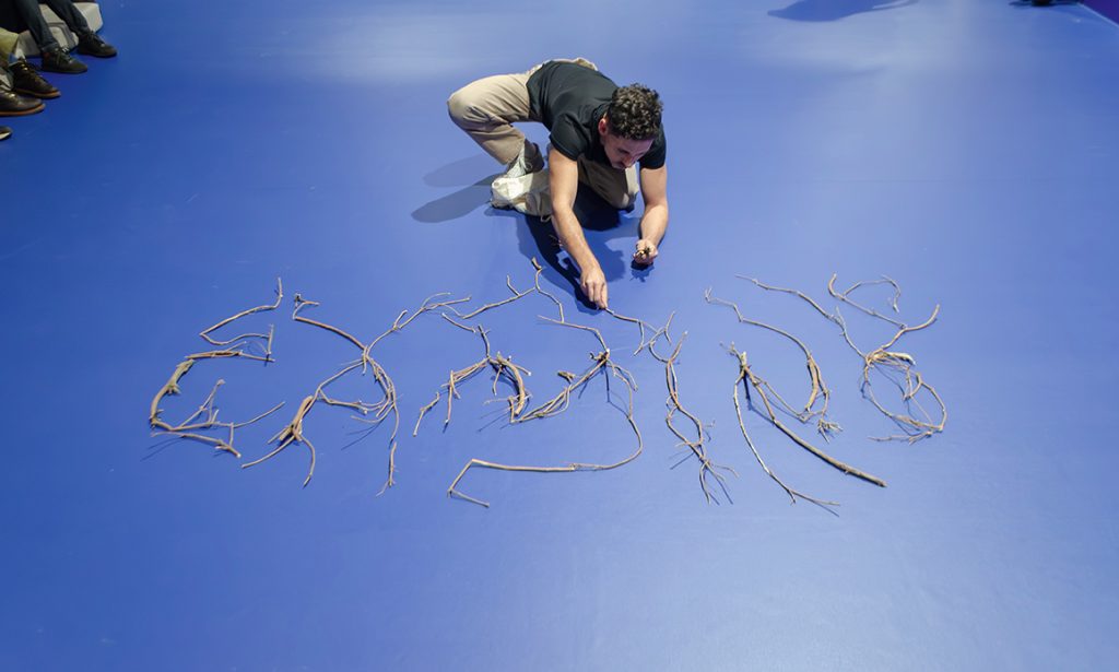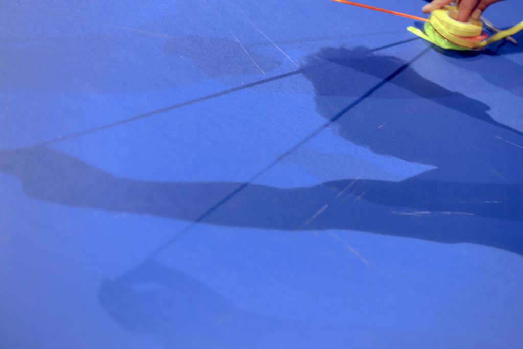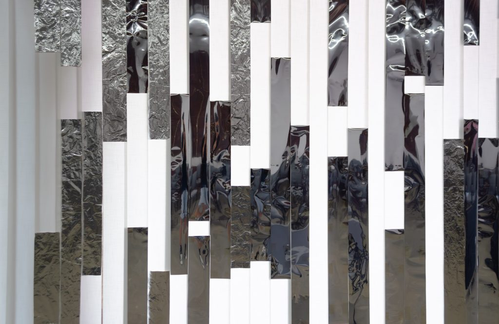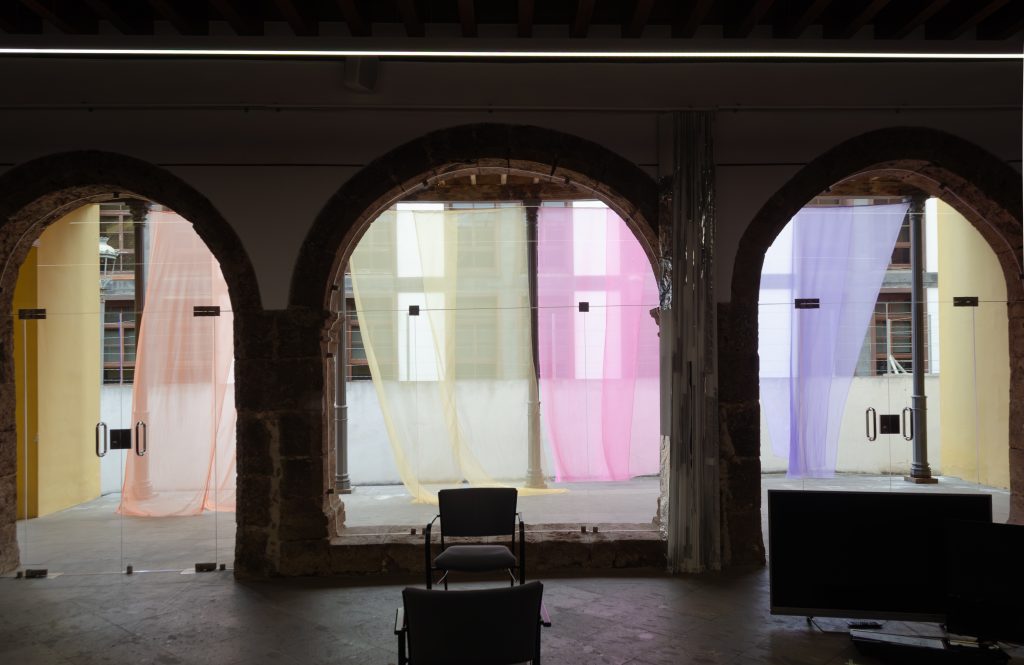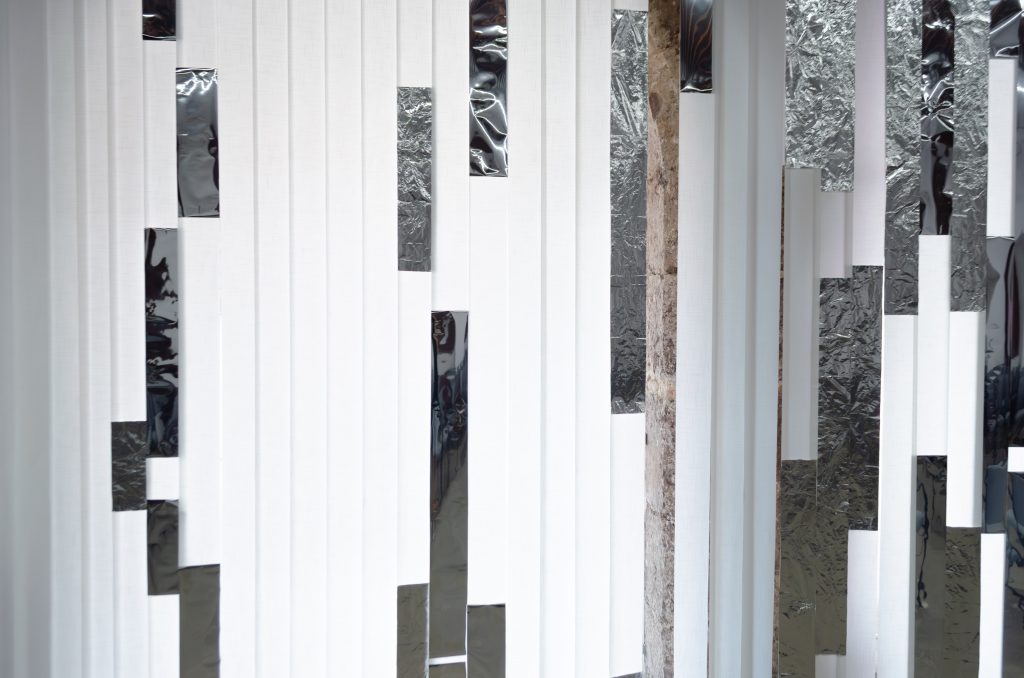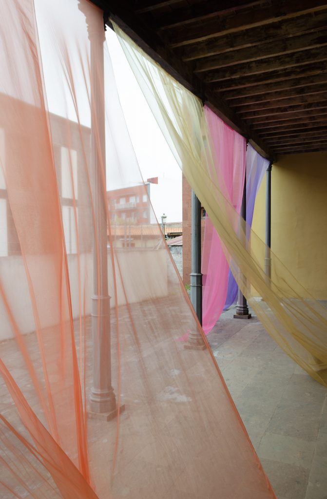 Detrás de las cortinas verticales hay una segunda escena, en el exterior de la sala, donde otras cortinas de telas vaporosas se mueven con el aire. Los colores nos remiten ahora a un atardecer. De este modo, la intervención emplea la tensión de elementos opuestos: presencia y ausencia, ocultación y revelación, color y blanco y negro, frialdad y calidez, oscuridad y luz, opacidad y transparencia, quietud y dinamismo; componentes binarios del transcurso de un ciclo.