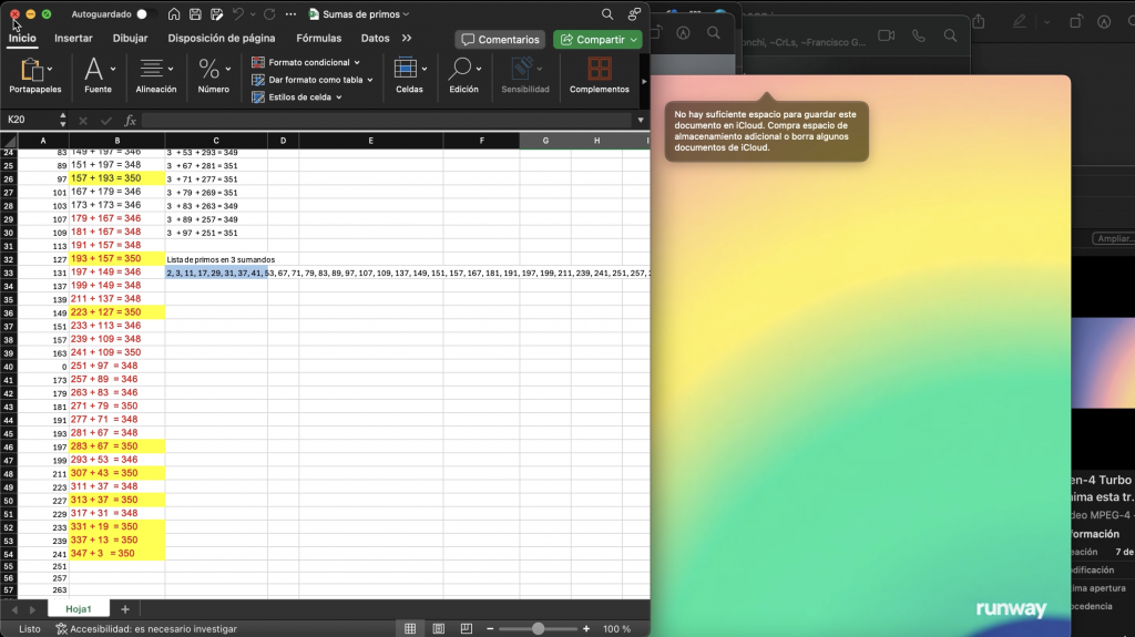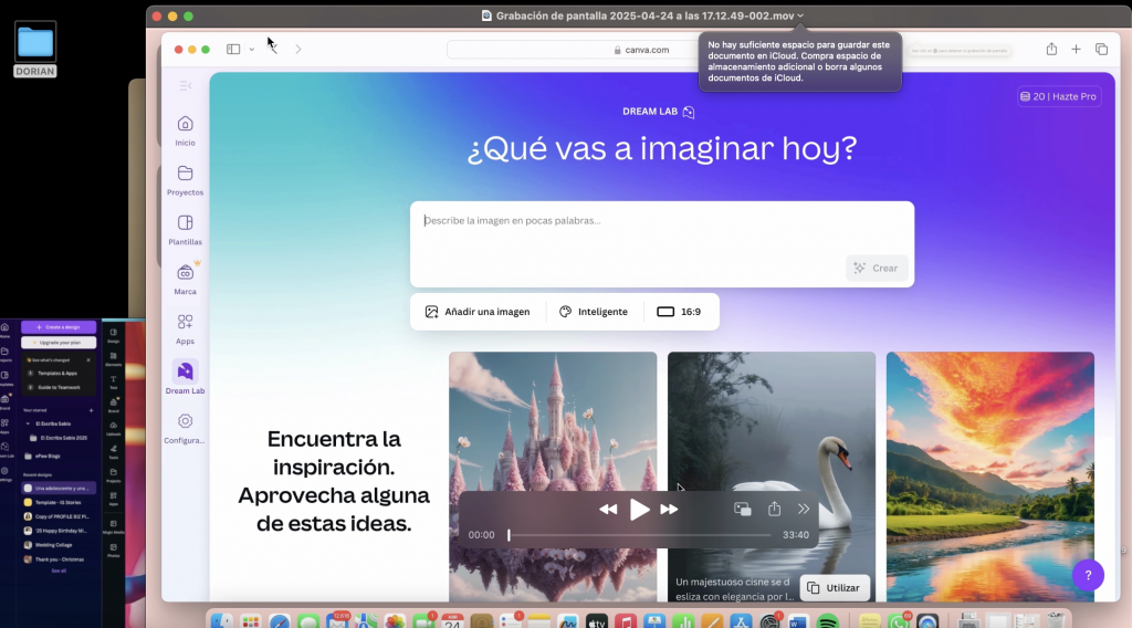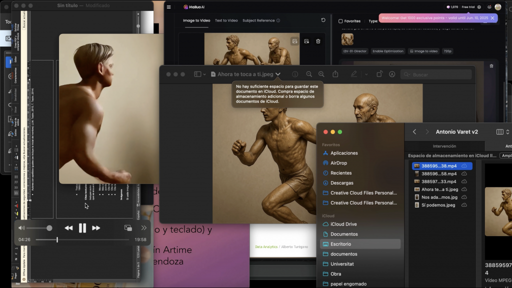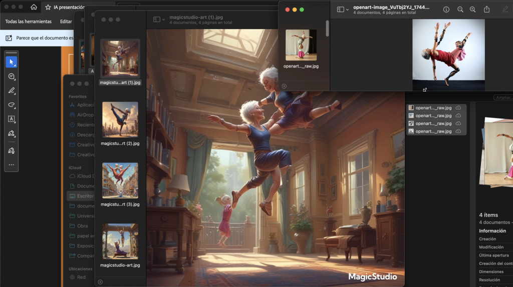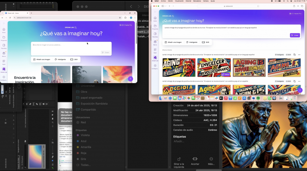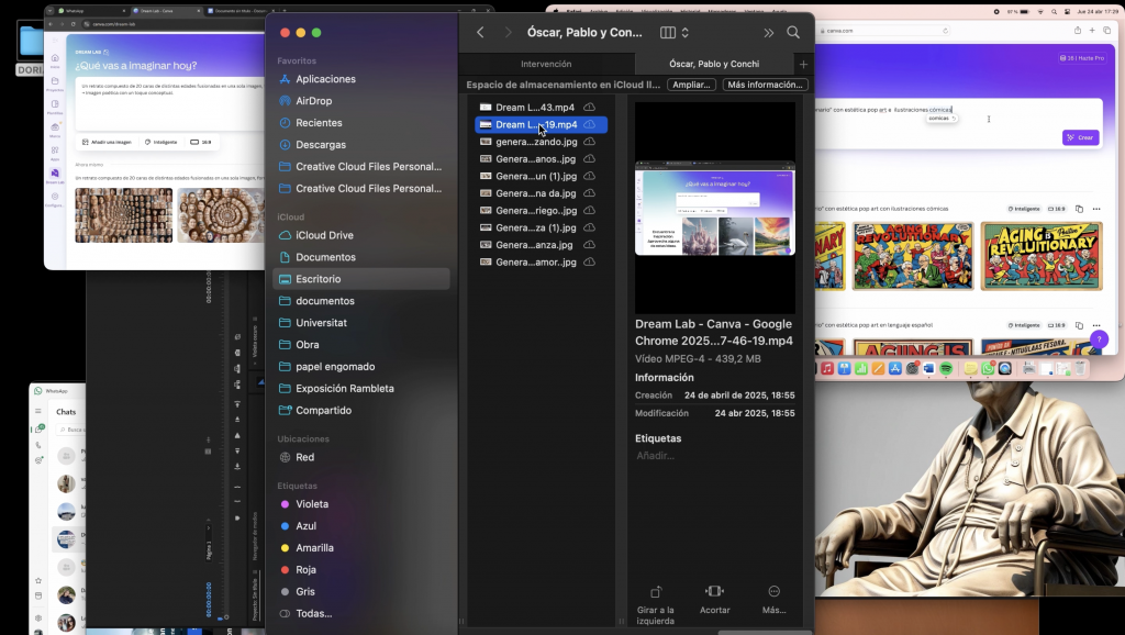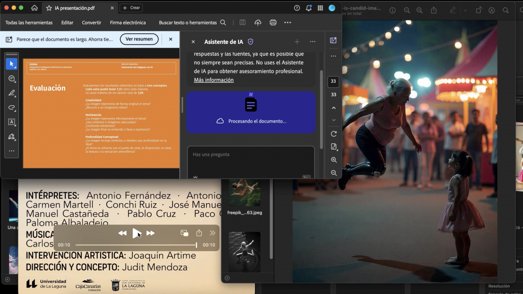 Esta primera escena se completa con dos vídeos. En el de mayor tamaño se despliegan, en un juego de ventanas superpuestas, los contenidos generados mediante IA durante los cursos de extensión universitaria. En el otro, se suceden colores planos en una representación del cielo al amanecer.
